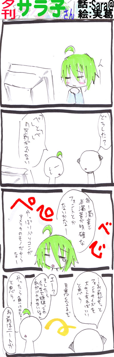 スポンサーリンク {タ}フォント,33 スポンサーリンク 夕刊サラ子さん X Facebook はてブ LINE コピー 2007.06.16 夕刊サラ子さん この記事は約1分で読めます。 スポンサーリンク 字を小さくしてる人にとっては共通の課題であります。 個人的にも確認しない人なんですが、フォントサイズが「中」でも区別が既につきません。 ぺべベペ それがカタカナでどれがひらがな、濁音半濁音かわかりますか? いいね:いいね 読み込み中…