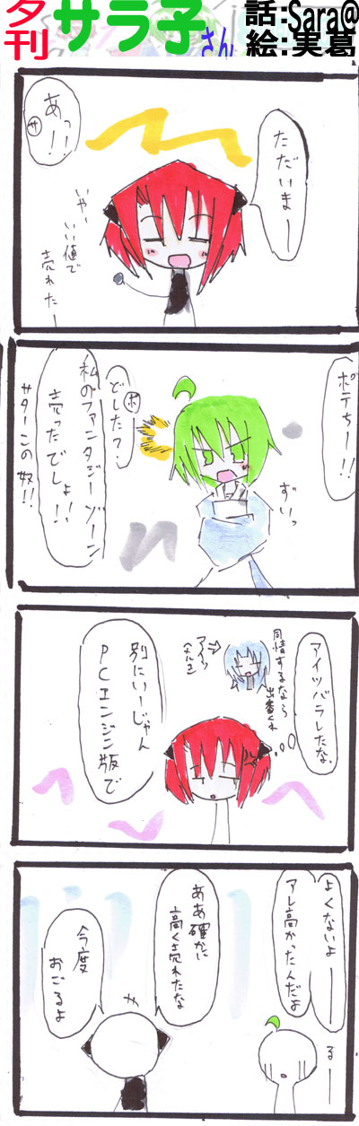 スポンサーリンク {タ}横領2,41 スポンサーリンク 夕刊サラ子さん X Facebook はてブ LINE コピー 2007.07.03 夕刊サラ子さん この記事は約1分で読めます。 スポンサーリンク 4コマ目のつっこみどころはちょっとアレですが、 サターン版のファンタジーゾーンはサターン持ってる人なら絶対に買った方がいいでしょう。 確かにプレミアついてますが、その価値はあるかも。 PCE版もいいけど、始まる位置が若干後ろだし(これはこれでいいけど)サウンドがちょっと汚いってのもあり、 ファミコンは論外だけど。 いいね:いいね 読み込み中…