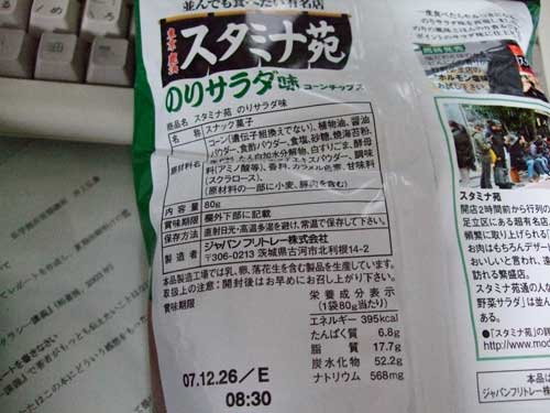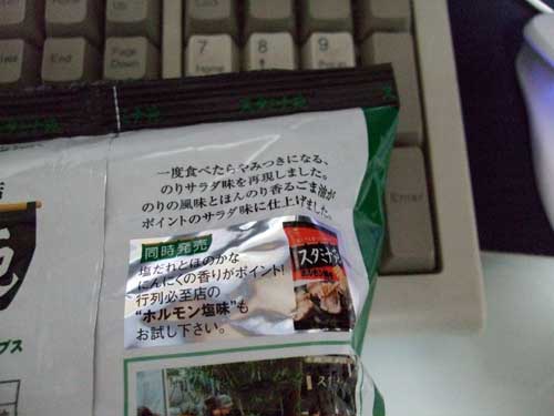スポンサーリンク {食}スタミナ苑のりサラダ味 スポンサーリンク コーンスナック X Facebook はてブ LINE コピー 2008.09.192011.12.02 コーンスナック この記事は約1分で読めます。 スポンサーリンク スタミナ苑のりサラダ味 前回ホルモン塩味を紹介しましたが、今回はありがたいことにサラダです。 まぁ、どちらも揚げてあるので箸休めにはなりませんけどね 健康的に緑色です。 名物特製サラダとのこと。 サラダが美味しい店って大抵美味しいですよね。松屋とか。 ということで、いただいてみます。 ジャパンフリトレーおなじみのこのタイプ。 ・・・・ うん。 確かにのりサラダです。 ごま油が効いていて中々いい感じです。 実物を食べてみたいと思いました。 メーカー :ジャパンフリトレー 価格 :98円 点数 :★★★☆ 原産国 :茨城県 購入場所 :SV戸田店 いいね:いいね 読み込み中…