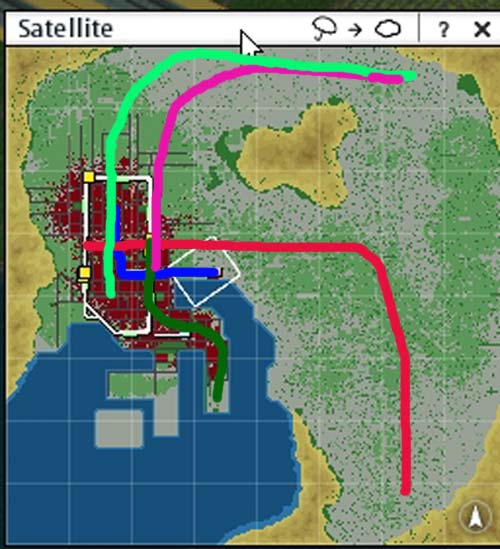 3:中央からまっすぐ右→右下の土地まで伸ばす路線(赤)